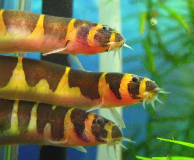 - Акантофтальмус кюля – основной цвет тела оранжевый от светлого до насыщенного. Поперёк располагаются от 6 до 20 широких полосок. Размер взрослой особи 9-12 см;
