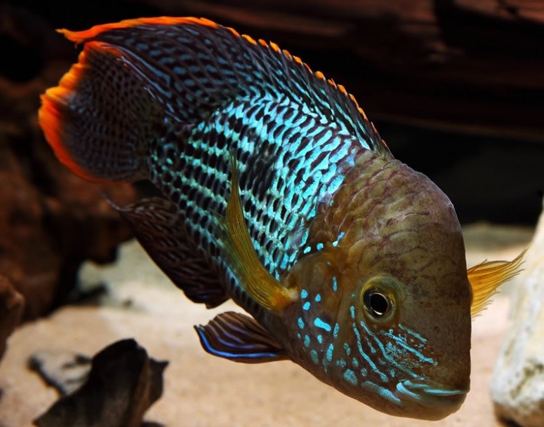 - Бирюзовая акара – крупная рыба с яркой окраской. Основной цвет тела тёмный серо-голубой, но каждая крупная чешуйка имеет сочную голубую окантовку, благодаря чему на теле рыбы присутствует замысловатый узор. Нет голубых рисунков только на лбу и верхней части головы, там проявляется только основной фон. Плавники окрашены в цвет тела, не имеют выраженных рисунков, только мелкий узор. По краям плавников тянется оранжевая окантовка. Отличительная особенность – тёмное пятно неправильной формы на боках;