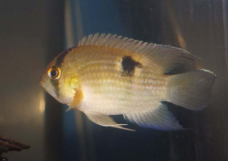 - Марони акара – тело имеет охристый, жёлтый или зеленоватый цвет. Есть поперечная слабовыраженная линия, которая проходит от лба через глаз. На боку ближе к хвосту чёрное пятно, от которого тоже спускается бледная полоса к брюшку. При перемене настроения становятся заметны другие тёмные продольные пятна на боках. Плавники в цвет тела, полупрозрачные. Характер мирный, почти нет агрессии к окружающим, но за себя рыбка постоять сможет. Не рекомендуются в соседи только очень агрессивные цихлиды;