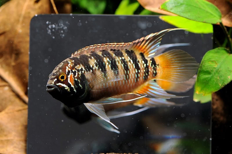 - Зебра акара – на основном оранжево-охристом фоне присутствуют вертикальные удлинённые пятна, которые начинаются со спины и немного не доходят до брюшка. Становятся насыщеннее, если рыба напугана или злится. В районе глаз и на жабрах есть узор из оранжево-белых линий причудливой формы. Низ морды чёрный или тёмно-оливковый. Плавники серо-оранжевые, играют блестящими вертикальными полосами в электрическом свете. Зебра относится к карликовым видам, вырастает не больше 8 см и без необходимости не проявляет агрессии к окружающим;