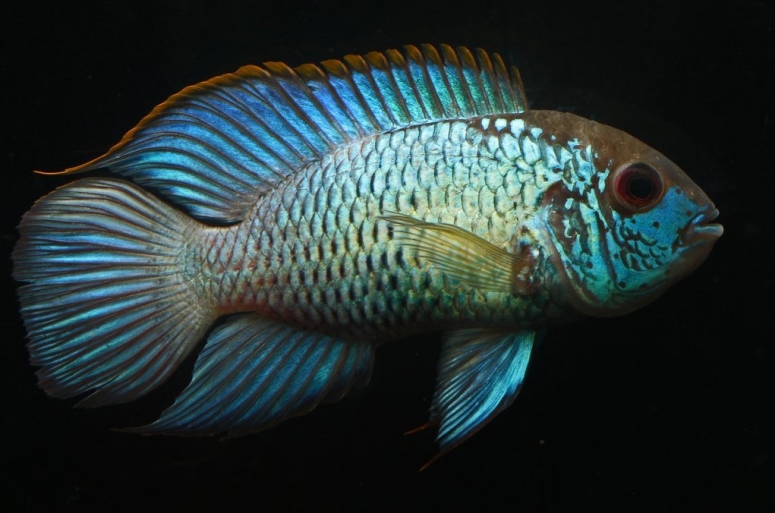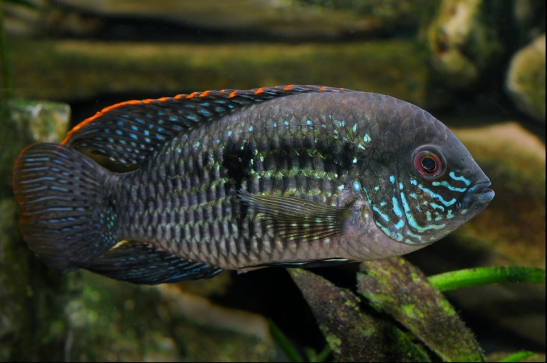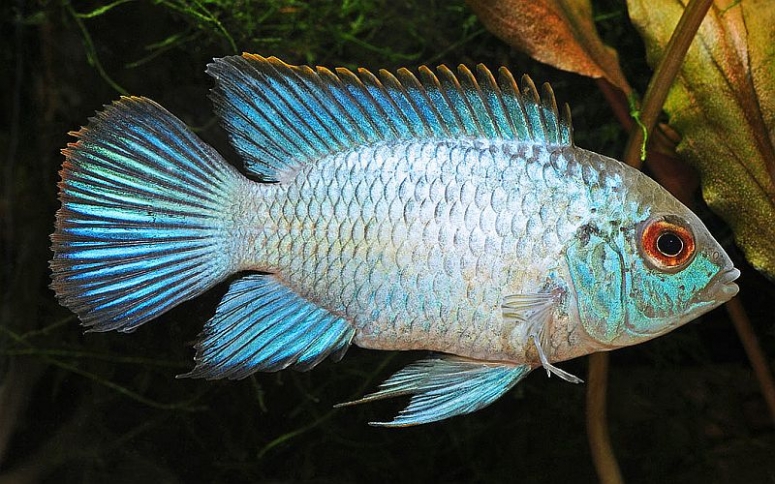 - Голубая акара – имеет голубовато-серое тело с множеством тонких продольных полос зелёно-голубого оттенка с перламутром. При хорошем освещении эти полосы искрятся ярко-голубыми пятнышками, особенно, в передней части головы под жабрами. Также на теле видны поперечные более тёмные и широкие полосы, а на боках – по одному или два небольших чёрных пятна. Рыба вырастает до 13 см, в аквариуме ведёт себя достаточно мирно и скромно;