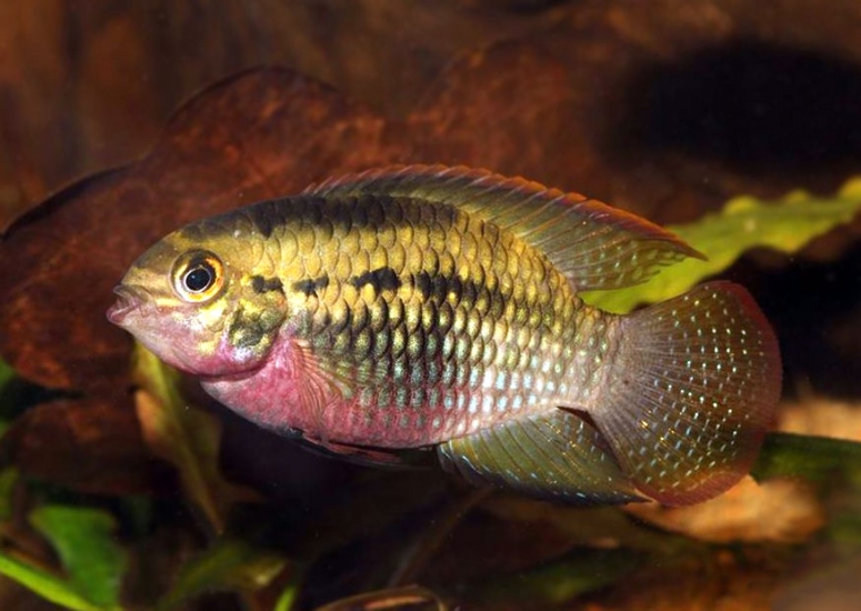 - Красногрудая акара – на зеленовато-жёлтом фоне видны едва заметные широкие тёмные поперечные полосы. В целом окрас темнее на спине и становится бледно-золотистым к брюшку. Отличительная особенность – низ морды и начало брюшка нежного рубинового цвета. При переменах настроения становятся заметны крупные чёрные пятна на боках. Размеры – небольшие. Рыбка обладает средней агрессивностью, территориальна, но из-за малых размеров (до 8 см) не представляет опасности для равновесных хищников. С агрессивными рыбами можно селить только в большой аквариум, где всем рыбам будет достаточно места;