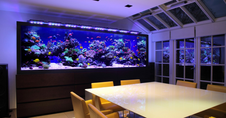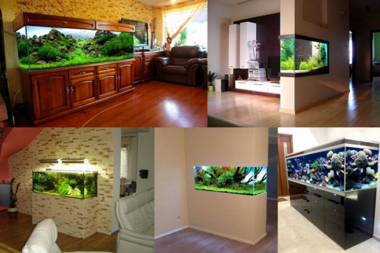 - Встраиваемый – производится на заказ, по замерам клиента. Минусы – дизайнеры обычно не учитывают, что аквариум нужно как-то чистить. Над конструкцией должно оставаться пространство 30-40 см;