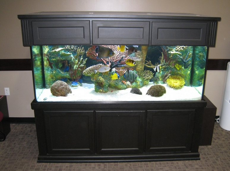 Расположение более крупных аквариумов допустимо только на специальную укреплённую поверхность: аквариумную тумбу или стол, прочно стоящий на полу. Столешница не должна «играть» и прогибаться. Для этого у аквариумных тумб есть специальный каркас жёсткости: дополнительные рёбра, которые начинаются от столешницы и доходят до пола. Вес аквариума – это: