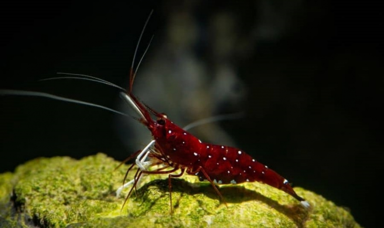 Индонезийская креветка кардинал — мечта любого аквариумиста, хотя крайне капризна в питании и уходе, подходит только для опытных заводчиков. Главная особенность — роскошный окрас, насыщенно-красный, почти вишневый, с белыми крапинками по бокам. Острый нос и длинные конечности придают рачку горделивый вид, а длина тела достигает 2 см.