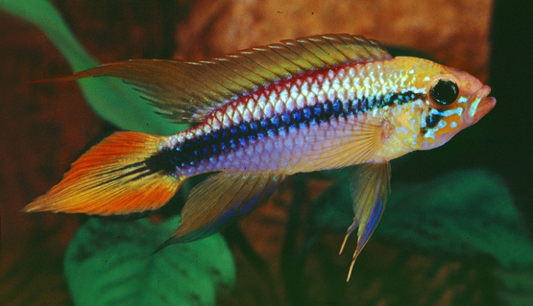 - апистограмма агассица – полихромная рыбка с множеством выведенных искусственно окрасок. Встречаются рыбки с ярко-голубыми переливами, жёлтыми и оливковыми полосами, красными плавниками. Хвостовой плавник закруглён. Вдоль тела может проходить чёрная полоса. Размеры: самцы – 8 см, самки – 6 см.