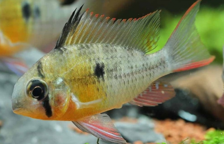 - апистограмма рамирези, бабочка – наиболее популярная представительница этих цихлид. Окраска сочетает голубые, жёлтые, красные, чёрные оттенки, каждая чешуйка окаймлена чуть темнее, за счёт чего основной фон покрыт рисунком. На передней части тела преобладает жёлтый с небольшими голубыми искорками. Затем жёлтый переходит в розоватый и далее покрыто бледными сине-голубыми поперечными полосами. Чёрный представлен в виде трёх пятен под спинальным плавником и поперечной полосой, проходящей по глазу. Плавники бледно-оливковые, полупрозрачные, тоже имеют вкрапления цвета: голубые искры, чёрные пятна. Несложно отличить самку от самца: она чуть меньше (до 7 см, в то время как самец может вырасти 8 см) и несколько бледнее окрашена.