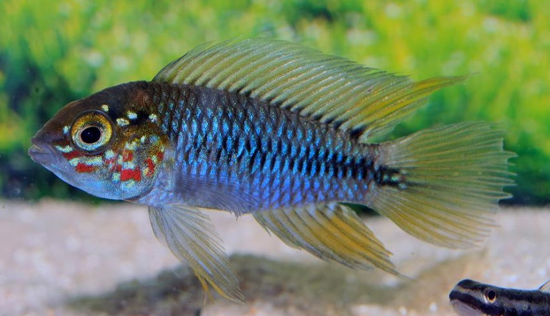 - апистограмма борелли – тоже полихромная рыбка, как и какаду. Преобладающие цвета – голубой, золотистый, синий. Могут встречаться представители с красными включениями на морде или фиолетовым оттенком всего тела. Спинальный плавник широкий, веерообразный, это хорошо заметно, когда рыба в отличном настроении или в состоянии обороны. При хорошем освещении рыбка переливается и блестит. Вырастает до 6-7 см (самки чуть мельче).