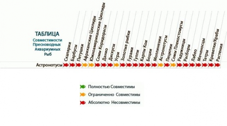 Астронотусы хорошо уживаются с рыбами крупных размеров. Их можно содержать в общем аквариуме с птеригоплихтами, цихлазомами и синдонтисами. Главное, чтобы объем аквариума соответствовал размеру и количеству жителей.