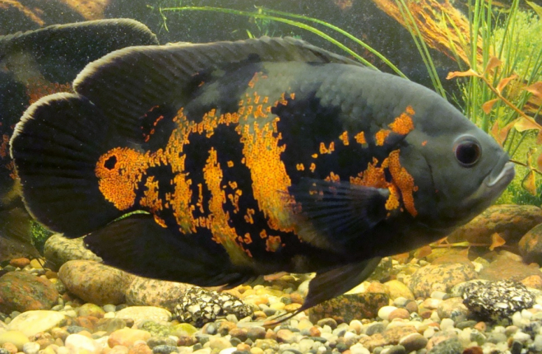 - Астронотус тигровый, или астронотус оскар – крупных размеров рыба, его тело достаточно сильное, имеет овальную форму, на голове расположены немного выпяченные вперед крупные губы. В аквариуме может вырастать в длину до 20-25 см. Его тело темного цвета, но украшено яркими оранжевыми пятнами. Еще одно название, которое получил тигровый астронотус – глазчатый, за наличие около хвоста черного пятна, окруженное оранжевыми пятнами.