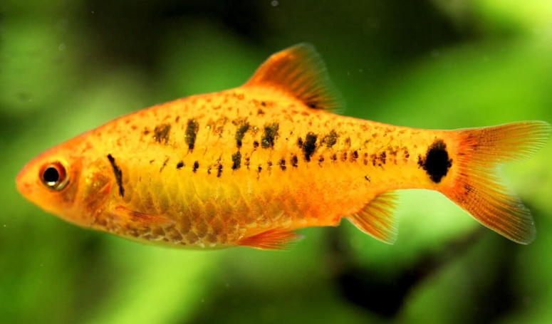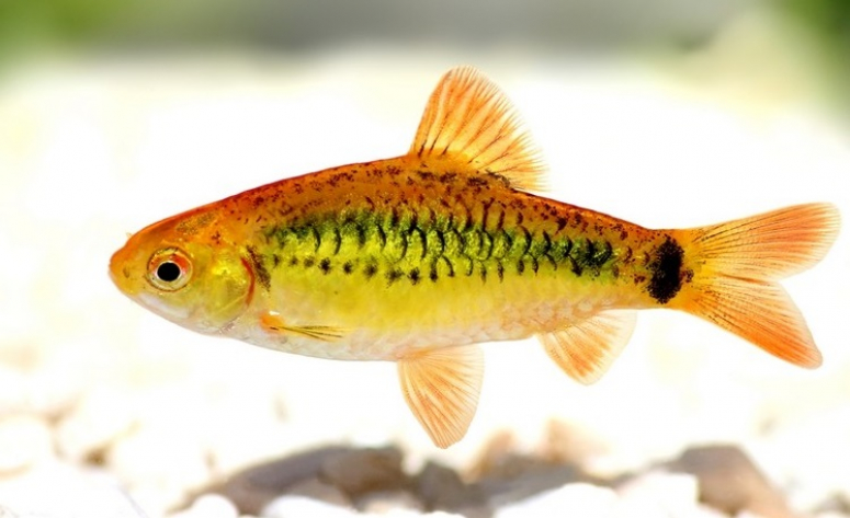 Это очень интересная, красивая и весёлая рыбка. Многим любителям по душе её резвость и очаровательный золотой окрас. В отличие от дикого барбуса, из которого и вывели такую разновидность, у неё нет зелёного оттенка чешуи, для неё типичен жёлто-золотистый цвет различных оттенков. На боковых линиях вдоль тела имеются тёмные пятнышки. Если установить верхнее освещение аквариума, то красота этих рыбок будет особенно подчёркнута.