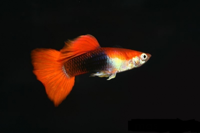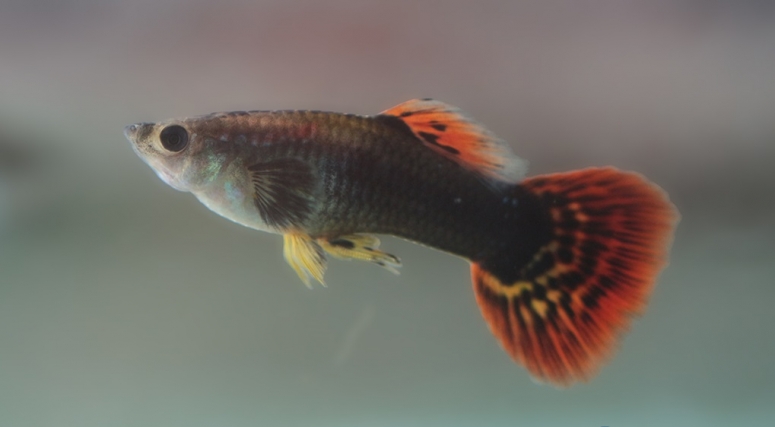 - Гуппи «испанец» – хвост крупный, красного цвета с чёрным кантом и чёрными полосами, повторяющими по форме край. Полосы местами переходят в пятна. Тело чаще всего серебристо-чёрное, темнеет к хвосту, но могут быть и другие сочетания;