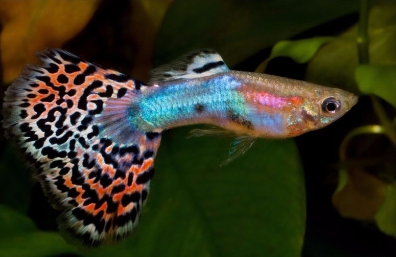 - Леопардовая гуппи – обладает ярко-жёлтым пышным хвостом в мелкую чёрную точку, основная окраска тела серебристо-жёлтых и голубоватых оттенков;