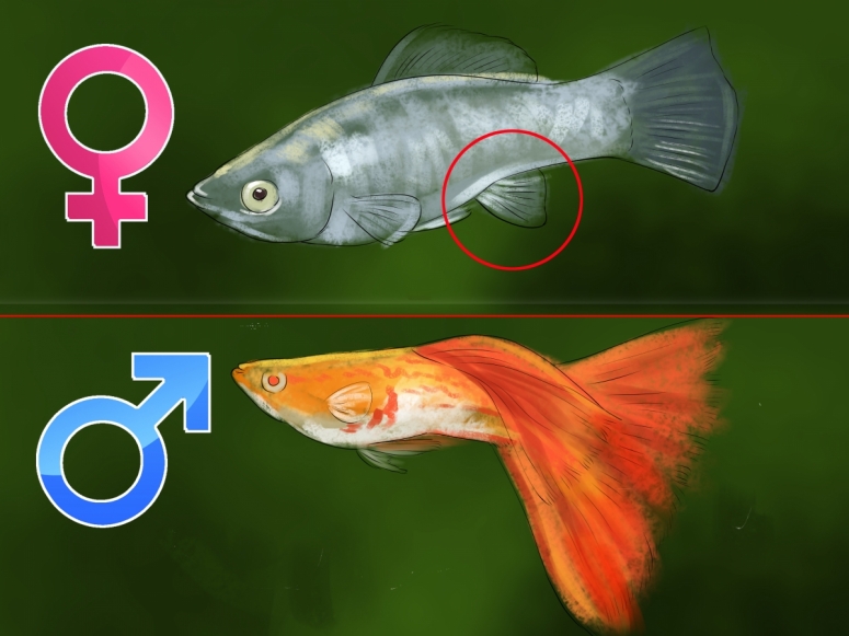 Самцы гуппи обычно меньше по размеру, имеют яркую окраску и длинные плавники, в то время как самки крупнее, более тусклые и имеют округлую форму живота. Также у самцов есть специальный плавник, называемый гоноподием, который используется для размножения.
