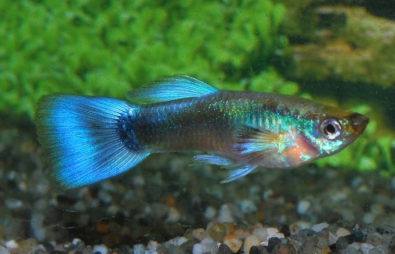 - Неоновый гуппи – окрас сочный, в голубых и зелёных оттенках, брюшко светлое, при хорошем освещении бока светятся словно неоновые. Хвост веерный, голубой, пышный. Тело ближе к хвосту темнеет;