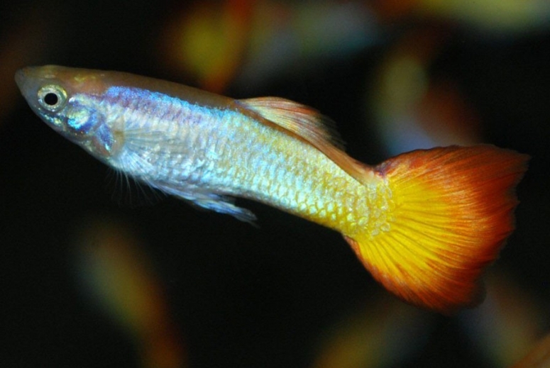 - Гуппи Сансет – тело серебристое, к хвосту становится оранжевым. Хвостовой плавник окрашен наподобие заката: цветовой переход от жёлтого в красный через оранжевый. Спинной повторяет окрас хвоста. Сами плавники небольшие;