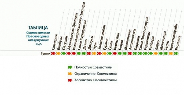 Теперь о том, какие виды категорически не подходят для содержания в одном аквариуме с этими маленькими тихонями. Полностью исключена возможность общего проживания с золотыми рыбками. Они попросту погубят гуппи. Опасны для них также рыбы-меченосцы, которые будут их кусать и пожирать мальков. Барбусы тоже не оставят их в покое, они стремятся покусать гуппи, их привлекают яркие, красивые плавники. Это же относится и к меченосцам. Скалярии, которые кажутся безобидными, тоже не подходят для проживания с гуппи: взрослые особи довольно агрессивны. Африканские цихлиды – опасные хищники, они непременно сожрут мелких рыбок. По той же причине нельзя селить гуппи и с южноамериканскими цихлидами и астронотусами. Не очень подходят для гуппи также агрессивные лабео.