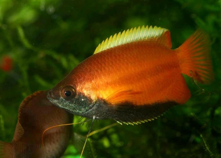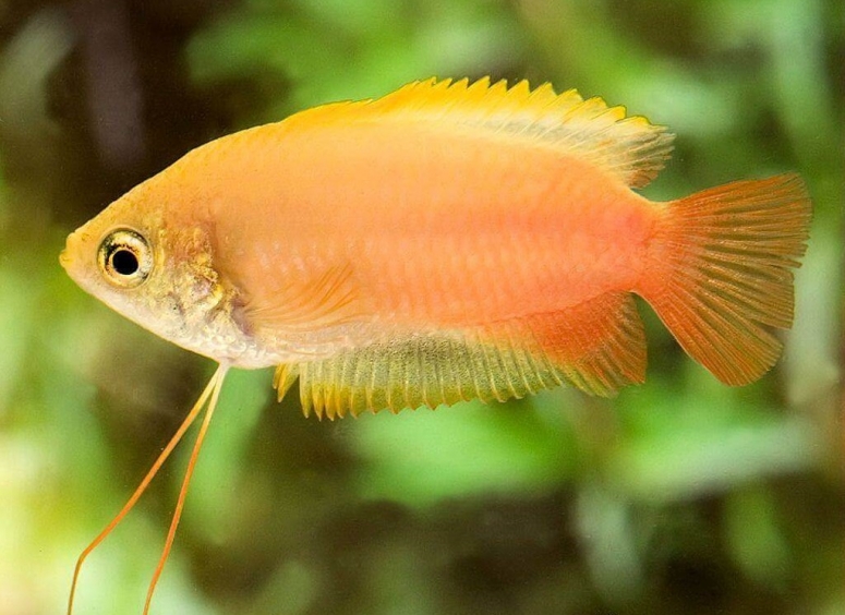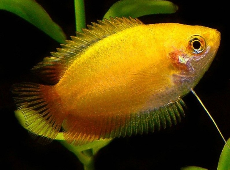 Такое оригинальное название эти рыбки получили из-за своего замечательного цвета, который может варьировать от жёлто-оранжевого до буровато-коричневого. Чаще встречаются золотые и красные оттенки. Именно они ценятся больше всего. При нересте самцы обретают яркий, насыщенный медовый цвет. Форма тела гурами сплющенная с боков, овальная, к голове заостряется. Рот небольшой, чуть вытянут вверх. Глаза крупные. На груди имеются маленькие прозрачные плавнички. Брюшко снабжено длинными тонкими плавниками-антеннами для осязания. Размеры небольшие – 4-5 см, изредка встречаются отдельные особи до 7 см. Он несколько похож на лялиуса. Но у гурами поменьше хвостовой и спинной плавники. В период размножения они приобретают красно-оранжевый цвет. А голова и брюшко становятся у некоторых разновидностей насыщенно синими. Также у самцов эти плавники заостренны на концах.