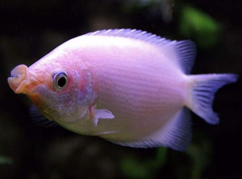 - Гурами платиновый – выведен селекционерами, в природе не встречается. Имеет продолговатое тело с небольшими плавниками. Окрас – белый с серебристыми и жёлтыми оттенками. Ближе к хвостовой части проявляется рисунок: более тёмные полоски. Вырастают до 13 см, но продолжительность жизни в сравнении с остальными гурами небольшая – до 4 лет.