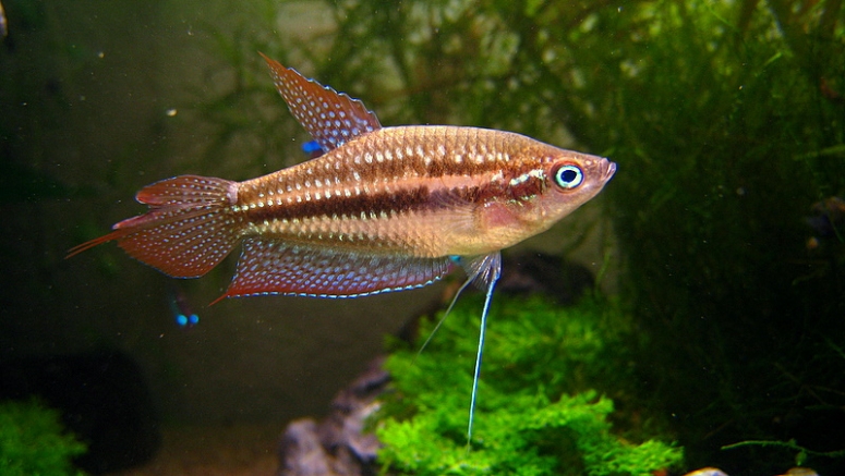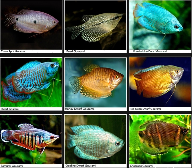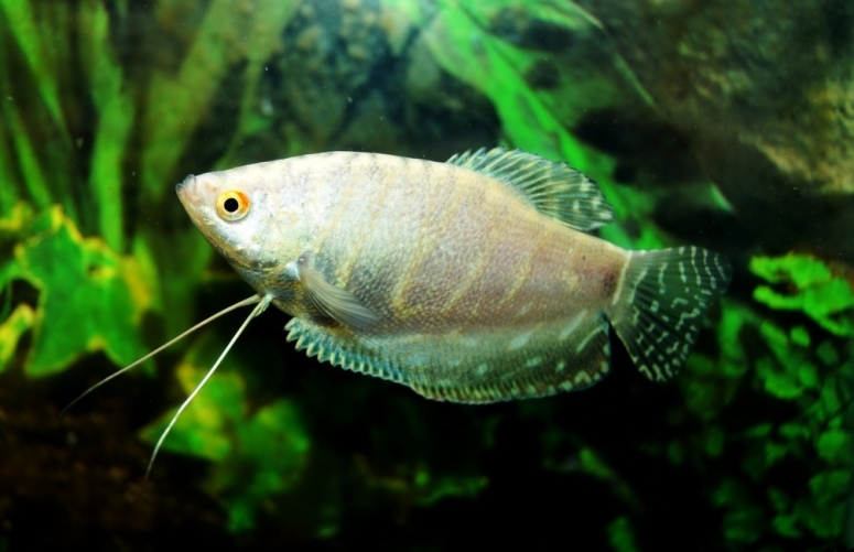 - Гурами ворчащий – обладатель самых необычных плавников среди гурами. В дополнение к длинным брюшным удлинённые лучи имеют и остальные плавники. Спинальный не тянется от головы до хвоста, зато резко удлиняется. Анальный плавник имеет три длинных луча ближе к хвосту. Хвостовой плавник каплевидный, сужается к краю. Цветовая гамма похожа на карликового гурами. Рыбка стайная, любит укрытия и коряги на дне. Вырастает до 8 см.