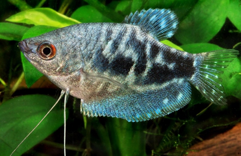 - Гурами голубой – эндемик острова Суматра. Тело равномерно окрашено в серый с голубыми переливами. При правильном освещении становятся заметны синеватые тонкие вертикальные полоски. Спинальный плавник небольшой. На хвостовом и анальном плавниках присутствуют едва различимые пятнышки, которые становятся ярче ближе к краям. На боку два чёрных пятна: одно посередине, второе ближе к хвосту. Размер аквариумной рыбы – 8-10 см, природные экземпляры вырастают до 14 см.