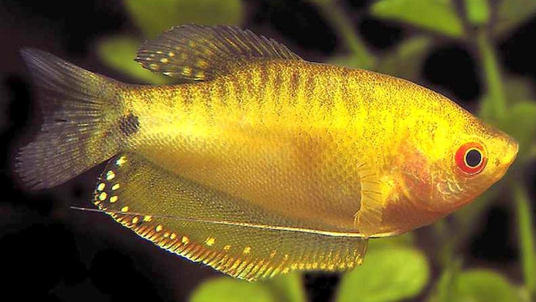 - Гурами золотой, гурами солнечный – золотисто-жёлтая рыбка с белёсым брюшком в районе брюшных плавников. Спинальный и анальный плавники небольшие, ближе к хвосту тело рыбки становится оражевым. Размеры – до 13 см. Рыбка требовательна к освещению и любит пространство для плавания. В природе встречается на острове Суматра.