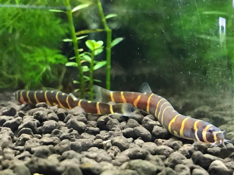 Змееобразный азиатский вьюн Кюля, он же акантофтальмус, в длину достигает 12 см. Бежевое тело украшено толстыми коричневыми вертикальными полосками.