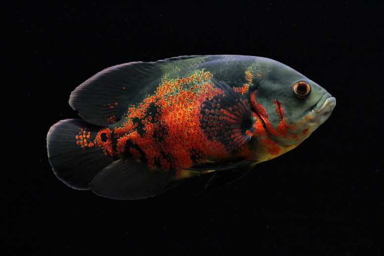 Амазонская цихлида в аквариумных условиях достигает 20 см. Овальное тело астронотуса украшено оранжевыми, голубыми или светло-зелеными пятнами на коричневом или черном фоне, создающими красивый лабиринтовый узор.