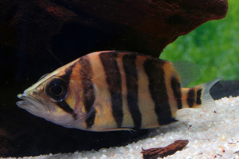 Азиатские хищные аквариумные рыбы вырастают до 30 см. Тело украшено продольными черными полосами на желтом фоне. Содержание сложное, не для начинающих заводчиков. Тигровый окунь требует качественное дорогостоящее питание и воду определенного уровня солености.