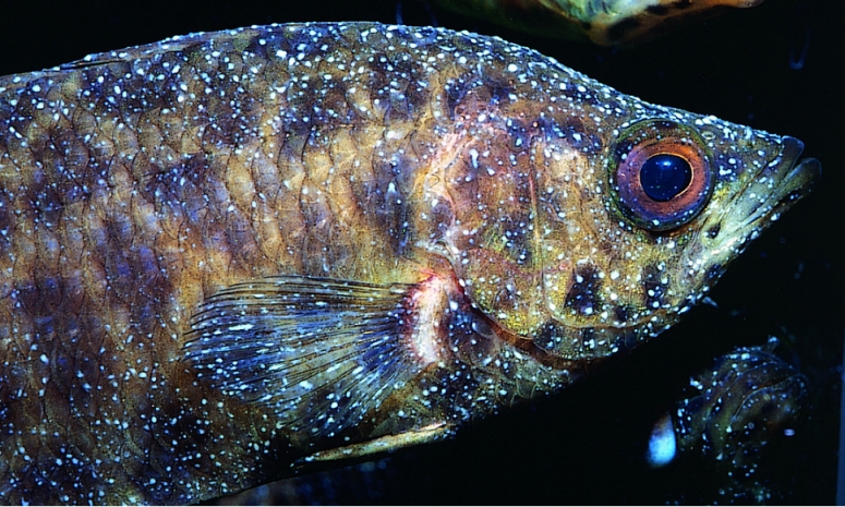 Болезнь белых пятен, также называемая «ихтиофтириозом» (произносится как «ик»), — это инфекция пресноводных рыб, вызываемая одноклеточным простейшим паразитом Ichthyophthirius multifiliis. У пораженных рыб на коже, жабрах и плавниках образуются небольшие белые кисты. Заболевание очень заразно и передается от рыбы к рыбе.