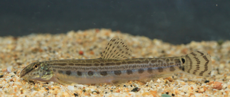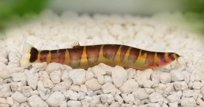 Акантофтальмус – симпатичный полосатый вьюн. Миролюбив, спокоен, но умеет за себя постоять: защищается с помощью острого шипа над глазом. Ведет уединенный придонный образ жизни.