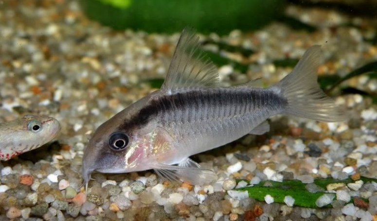 - Коридорас хаброзус – малыш едва достигает 2,5 см в длину. Тёмная спинка контрастирует со светлым брюшком, вдоль тела широкая чёрная полоса.