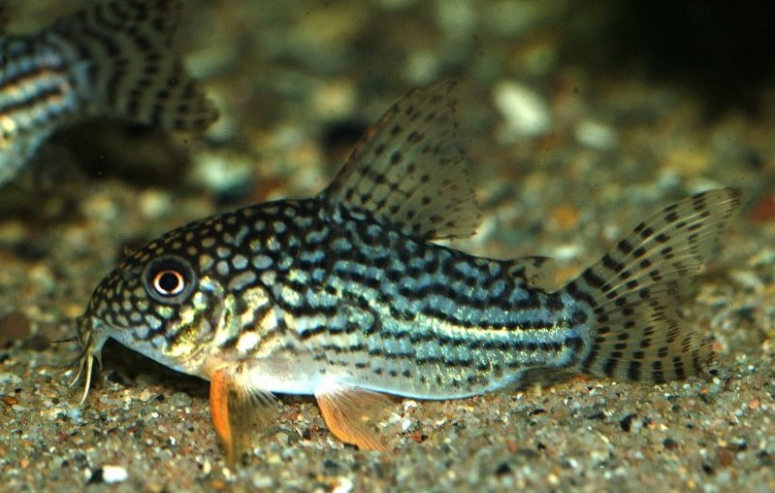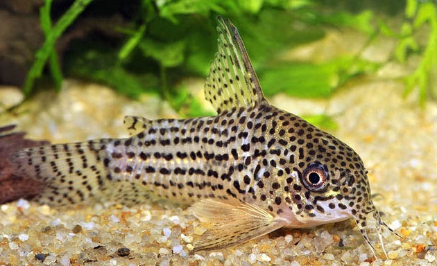 Крапчатый – пожалуй, самая распространённая порода в аквариумах новичков. Этот малыш способен на небывалые подвиги: выдерживает колебания любых параметров воды, отсутствие аэрации и фильтрации. Конечно, лучше не допускать резкого повышения или понижения температуры, загрязнения воды, так как это может сказаться на продолжительности жизни. Но хотя бы можно быть уверенным, что в случае непредвиденных ситуаций крапчатые коридорасы останутся в живых. Выглядят они достаточно просто: серо-оливковая спинка, светлое брюшко и крупные тёмные пятна по всему телу. Самки крупнее самцов, вырастают до 7 см в длину (самцы – до 5 см).