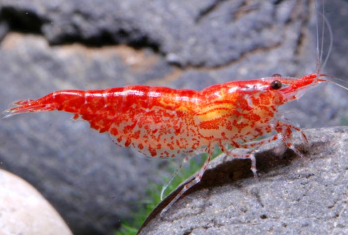 - Креветка Красная вишня – классическая разновидность. На полупрозрачном теле множество крапин, издали сливающихся в один красный цвет.