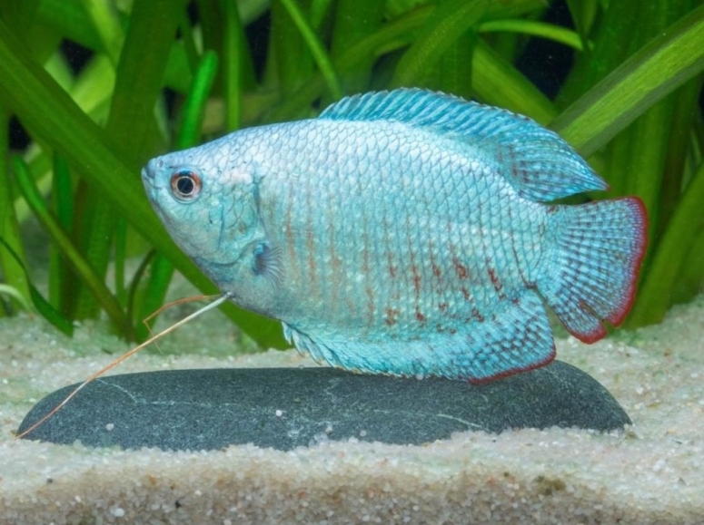 - Лялиус голубой – на сине-голубом фоне ближе к анальному плавнику проступают красноватые узорчатые тонкие линии. Плавники имеют оранжевую окантовку;