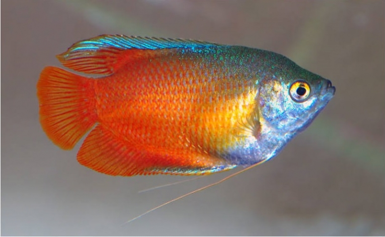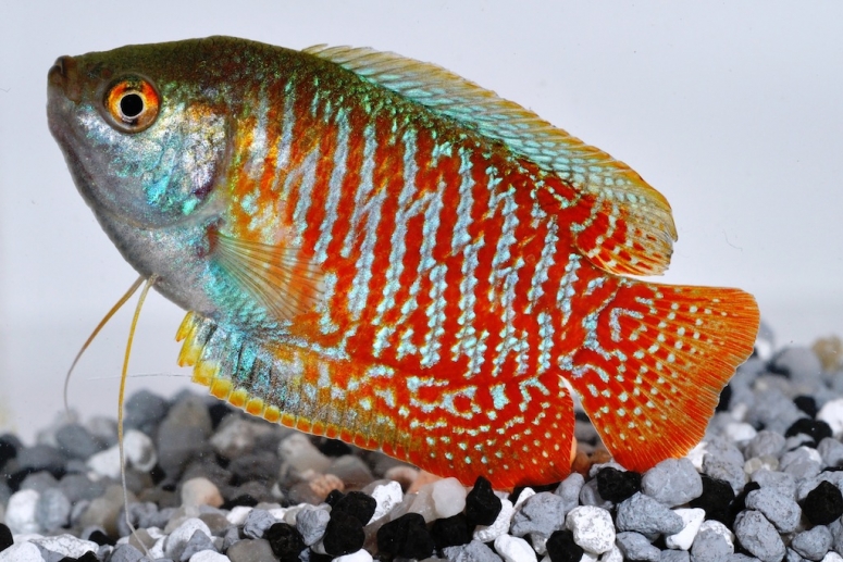 - Лялиус радужный – обладает сочетанием тонких красных и голубых полос поперёк тела. Полосы располагаются по диагонали, практически исчезают на спинке. Здесь рыбка становится почти красной, а к нижнему плавнику преобладает голубой окрас. В зависимости от освещения окрас меняется: красный становится оранжевым, а голубой – синим;