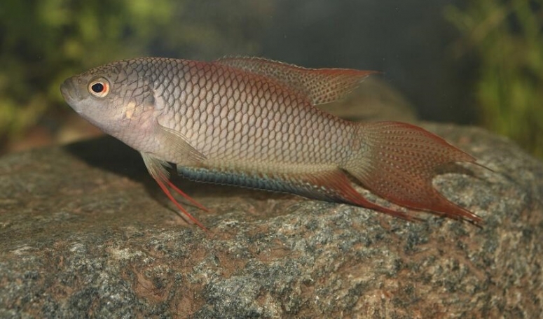 - Красноспинный макропод – один из самых «молодых» видов, появился в начале XXI века. Его окрас не имеет выраженных полос, цвет чешуи похож на перламутровый, отливает краснотой, но при разном освещении может быть от серебристого до зелёного. По краю плавников белая полоса.