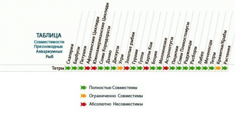 Общие правила совместимости – тетры могут соседствовать в аквариуме с другими тетрами или самостоятельно, так как они обкусывают плавники своим соседям в домашних условиях. Хищные рыбки могут питаться тетрами из-за их небольшого размера.
