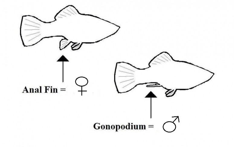 Перед приобретением пары необходимо знать, как определить пол. Самки имеют более крупный размер и достигают до 10 сантиметров в длину, в то время как самцы вырастают до 6 сантиметров и имеют острый анальный плавничок гоноподий – это половой подвижный копулятивный орган, характерен для пецилиевых.