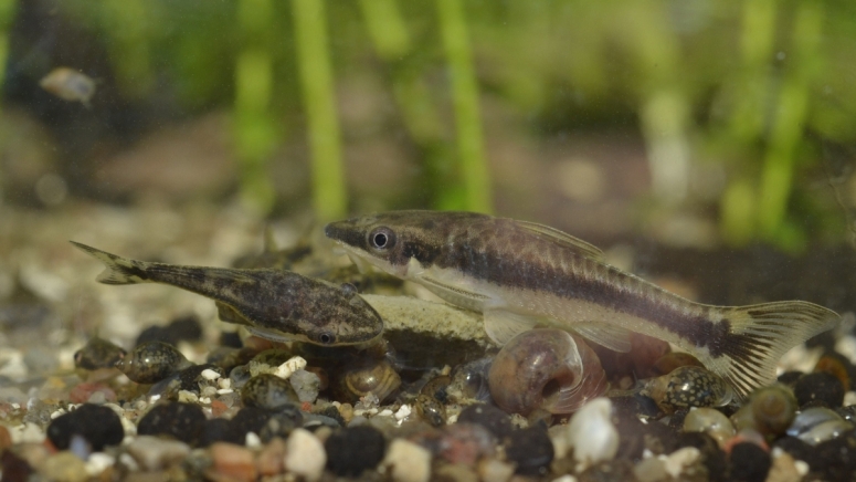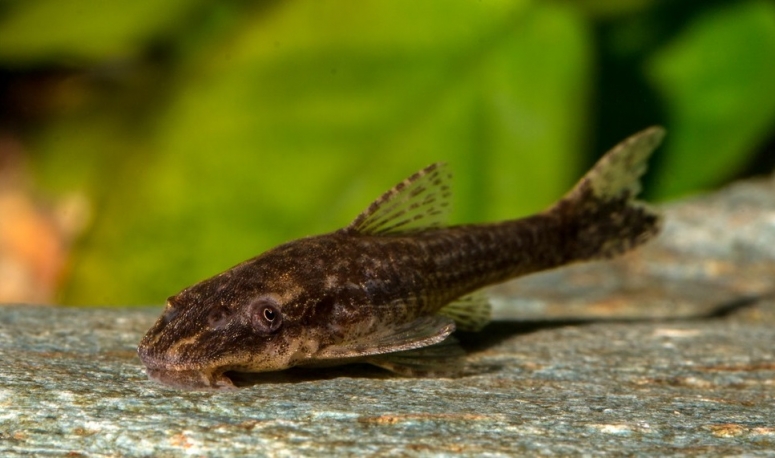 - Отоцинклюс арнольди – его легко спутать с обыкновенным водорослеедом, отличие в том, что пятнышки темнее и более чёткие, особенно, на спинке.