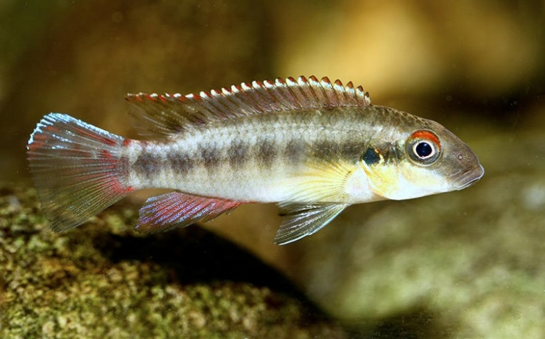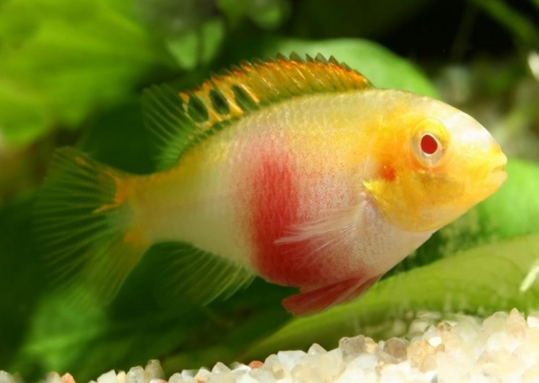 - Желтобрюхий пельвикахромис – основной цвет тела бежевый с тёмными пятнами и неизменным рубиновым пятном на брюшке;