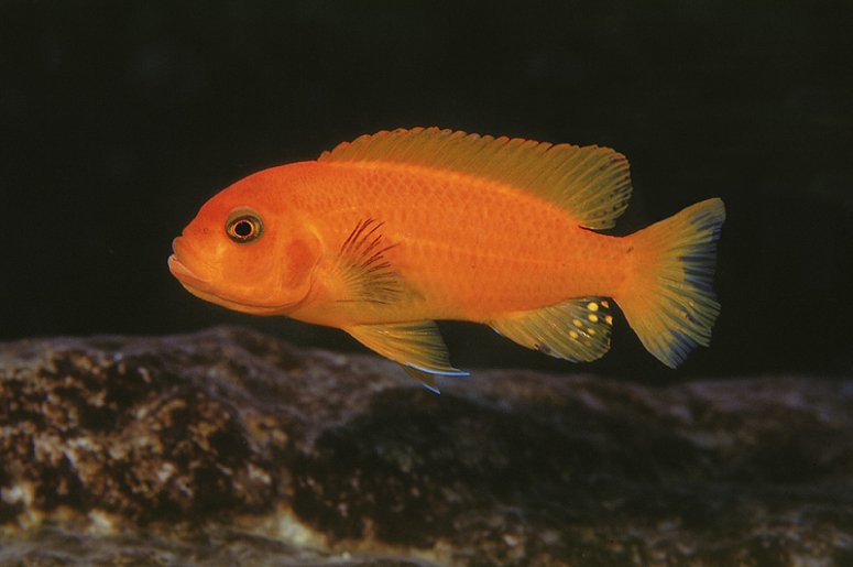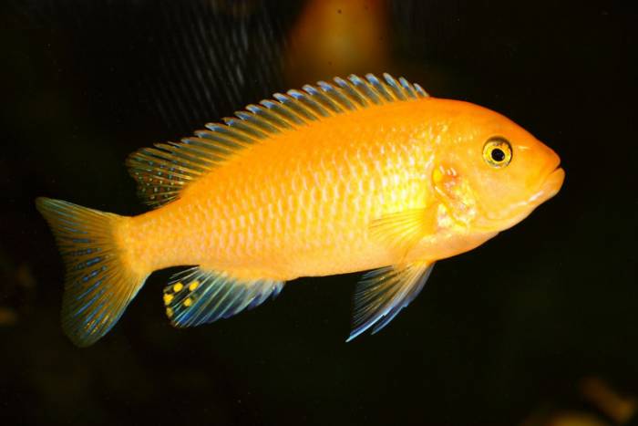 - Желто-оранжевая. Рыбки яркие и привлекательные, благодаря насыщенному оранжево-желтому окрасу. Анальные плавники украшены темными пятнами.