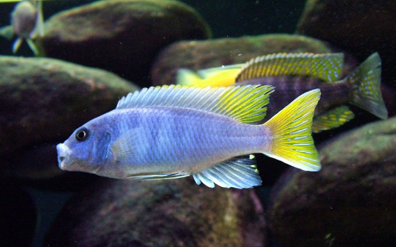 - псевдотрофеус саулози – самки этих рыбок жёлтые, а половозрелые самцы – голубые. У самцов хорошо видны поперечные полосы, плавники почти чёрные, с тонким белым кантом. В аквариуме достигают 10 см, считаются агрессивными и территориальными;