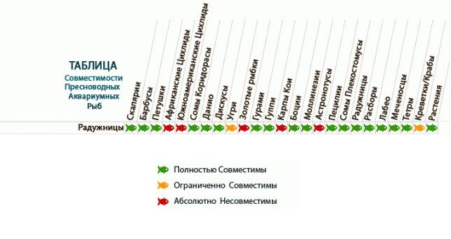 По характеру радужницы активные и миролюбивые рыбки. Они прекрасно соседствуют с некрупными, спокойными видами: гурами, петушки, барбусы, сомики, дискусы, тернеции. Нельзя подселять к радужницам агрессивных рыбок – цихлид, хромитусов, астронотусов.