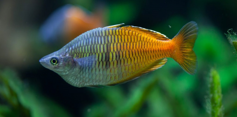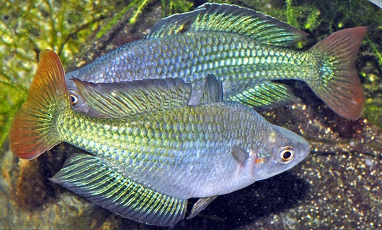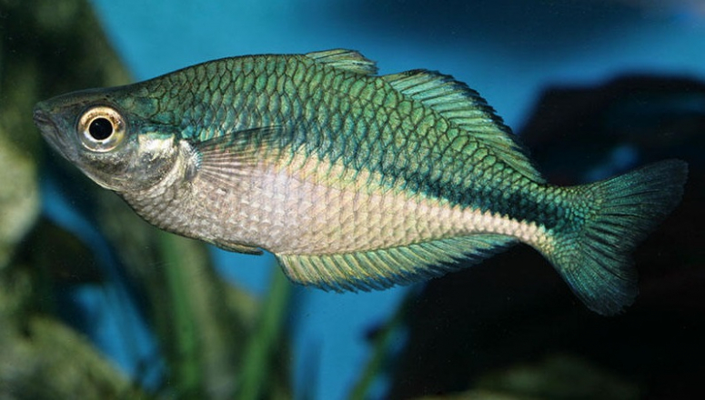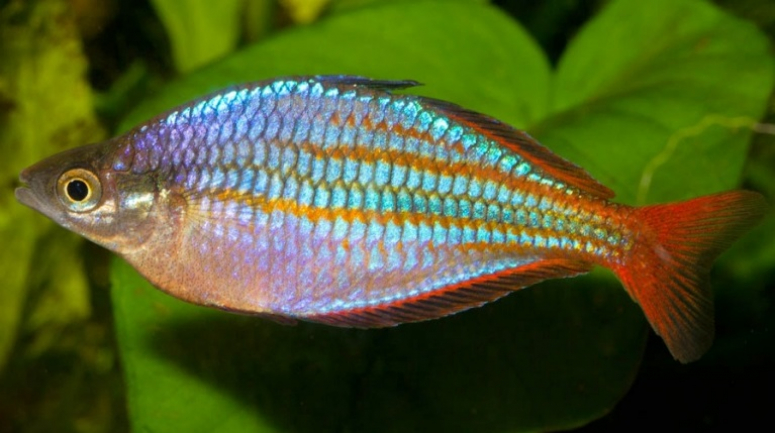 - Радужница бирюзовая, меланотения – эндемик новогвинейского озера Кутубу. Форма тела стандартная для радужниц, окрас – мерцающий синий, переходящий в зелёный. Переливается от серебристого до насыщенно фиолетового. Комфортная температура 22-25°C.