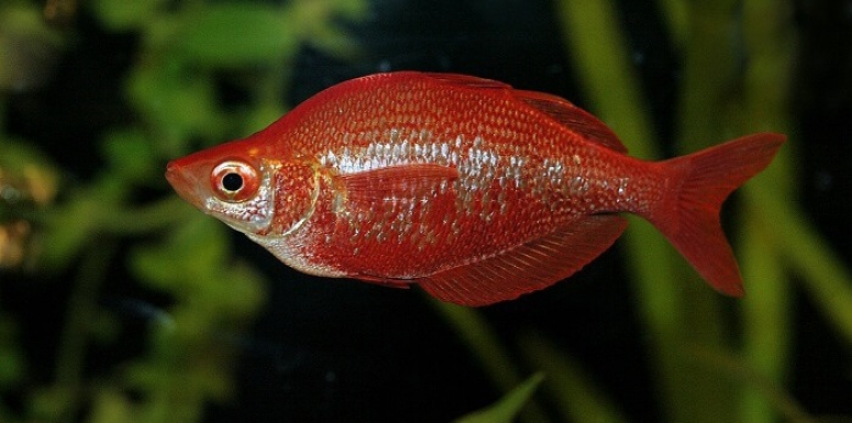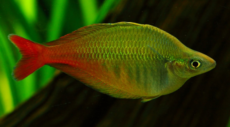 - Радужница трехполосая – вдоль тела по бокам от головы к хвосту тянется чёрная полоса. Основной оттенок тела – красный. Над и под чёрной полосой заметны голубовато-зеленоватые полосы, мерцающие при хорошем освещении. Чтобы трёхполосая красавица не теряла окрас в неволе, ей стоит подбирать аквариум попросторнее. Комфортная температура 22-25°C.