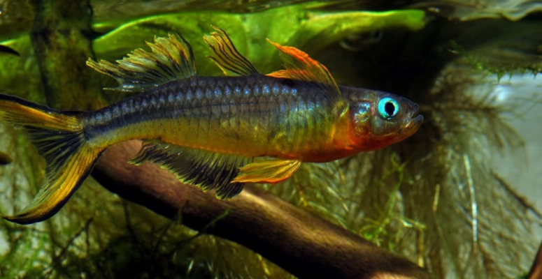 - Радужница боэсмана – имеет в окрасе два основных цвета. Передняя половина тела у неё насыщенно синяя, а хвост – ярко-оранжевый. Рыбка переливается цветами радуги. Глаза чёрные. Вырастает до 7-10 см. Теплолюбива, комфортная температура для неё 25-29°C.