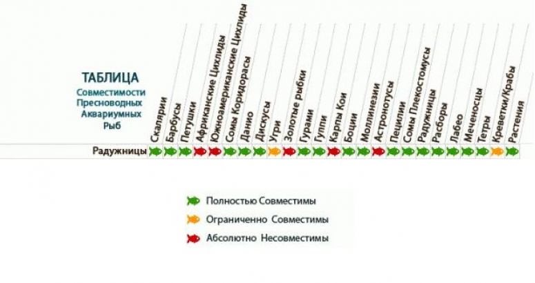 Если моновидовой кажется слишком скучным, в соседи можно выбрать таких же мирных рыбок со схожими параметрами содержания: барбусы, тернеции, кардиналы, пецилии и так далее. Совместимость с хищниками, даже небольшими, у радужниц невозможна.