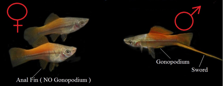 - У самцов анальный плавник превращен в трубчатый гоноподий, у самок он обычный;