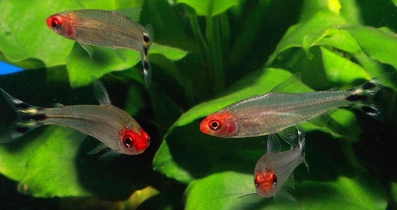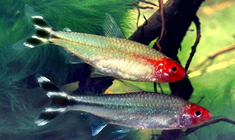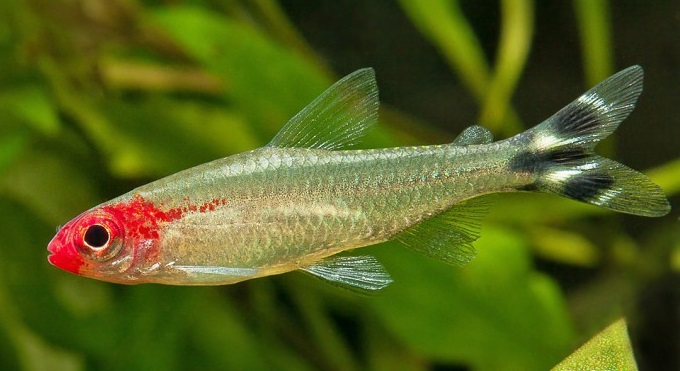 Родостомус, или как ее еще называют, красная тетра – небольшого размера аквариумная рыбка. На голове и носу у нее имеется небольшое красного цвета пятно, за что ей дали еще одно название – красноголовая тетра. Когда рыбка переживает стресс, пятно становится более тусклым. Но в хороших условиях, окрас головы становится ярче, поэтому данное пятно служит для идентификации состояния родостомуса и тех условий, в которых он обитает. Хвост рыбки украшен черно-белыми полосами, а тело удлиненное, вытянутое и имеет серебристую окраску, со светло-зеленым отливом. Сама рыбка достигает в длину до 4-5 см.